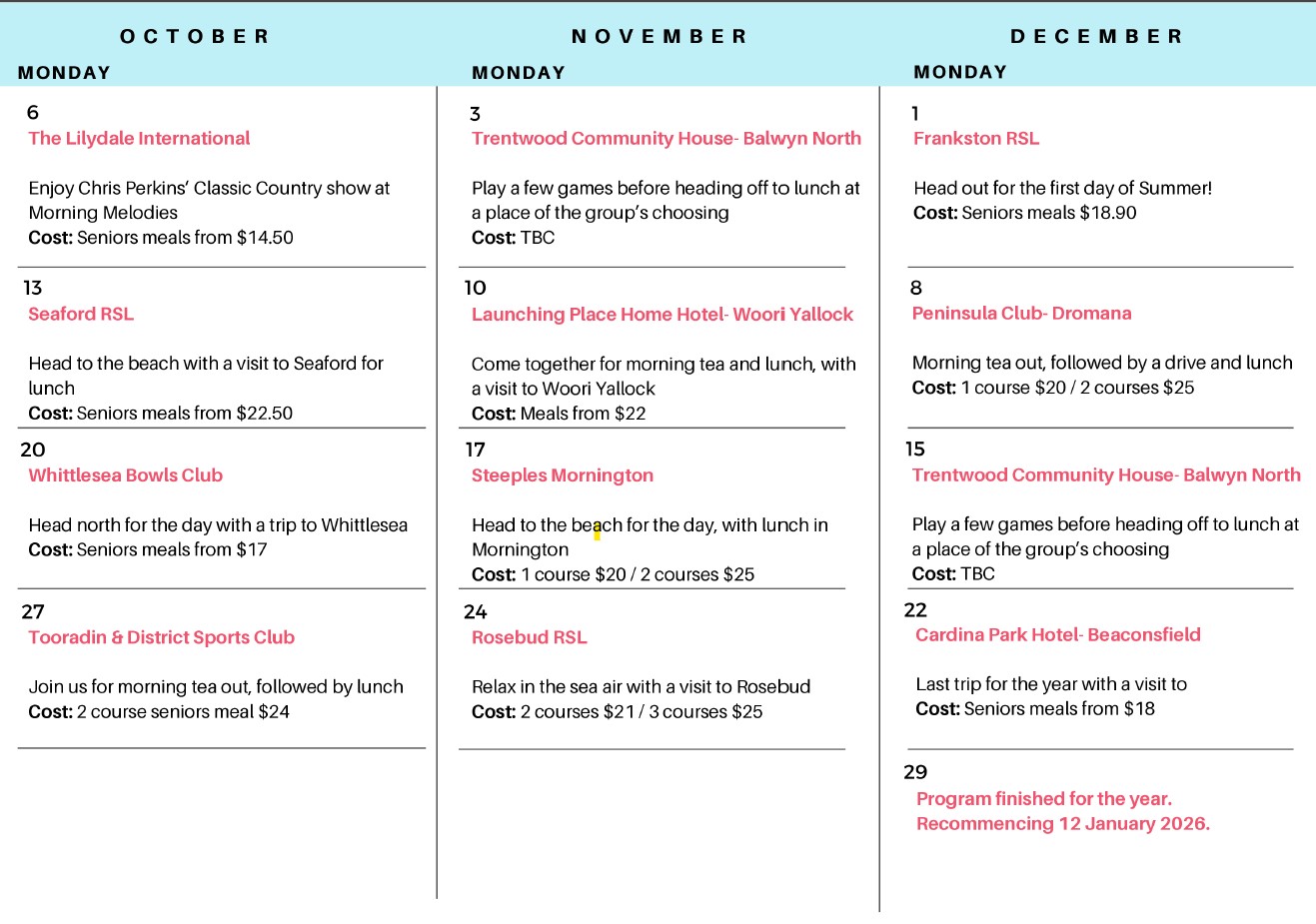 Cost: Bus outings are $15 per trip, plus the cost of meals. Invoices will be issued monthly.