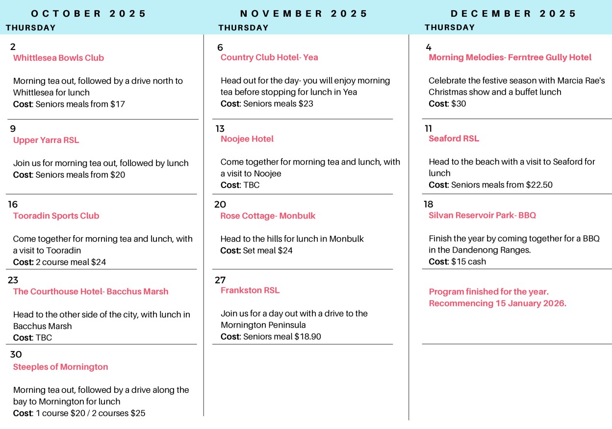 Each trip will explore a different spot in greater Melbourne area, please refer to the calendar below for destinations of each week.